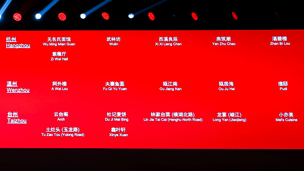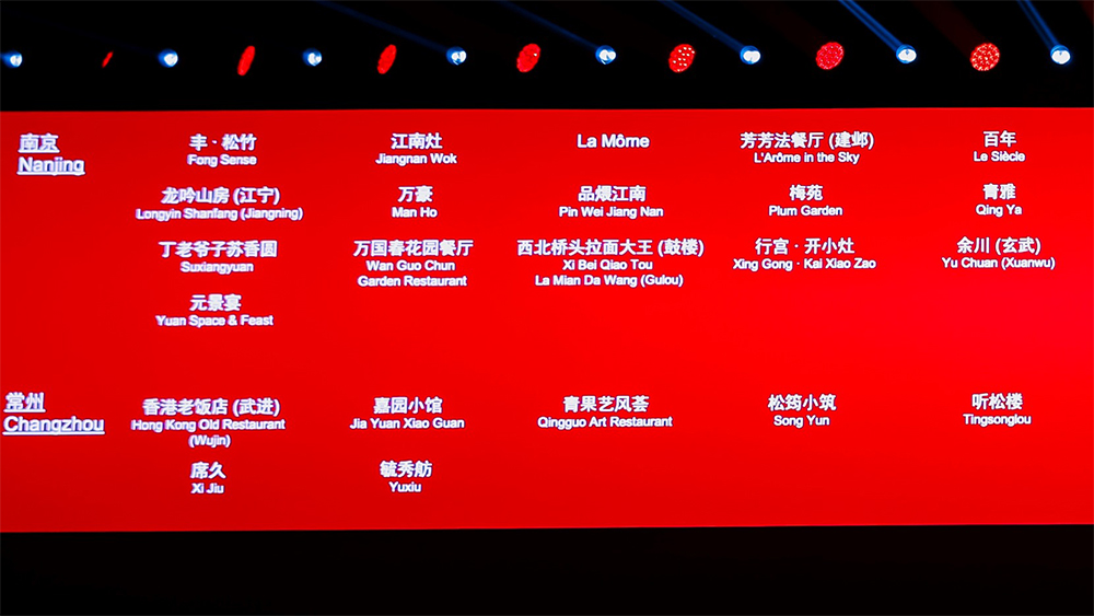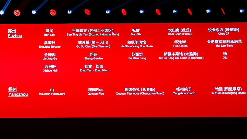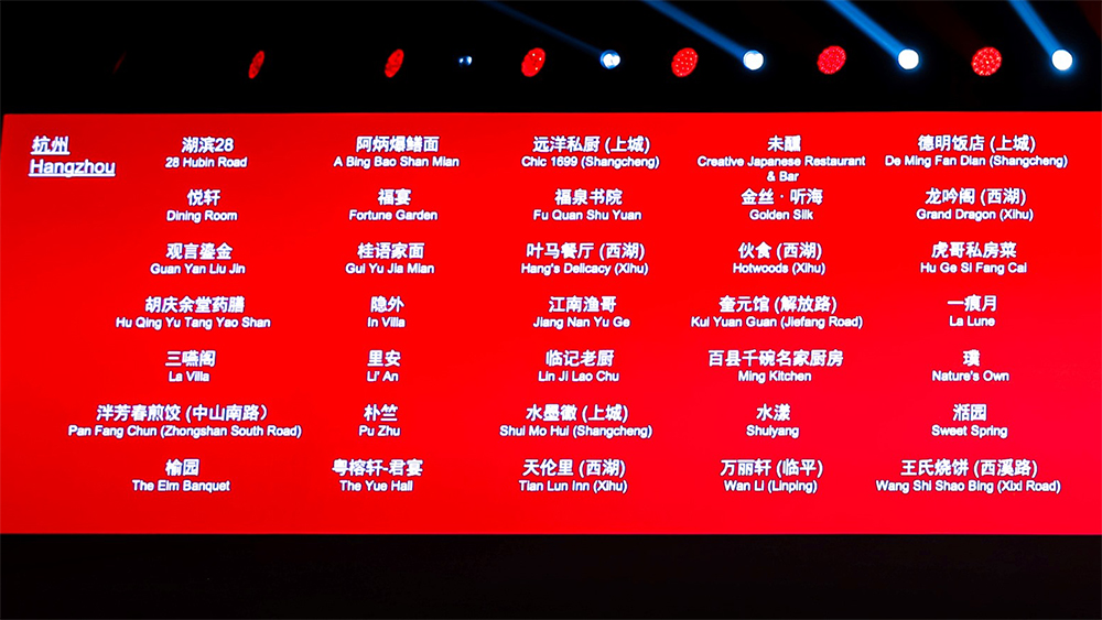 杭州:珀、桂语山房(西湖)、金沙厅(杭州西子湖四季酒店)、龙井草堂、暗香、新荣记、兰轩(杭州法云安缦)、Sense、颂(杭州中心四季酒店)、玉芝兰、雷克拉法餐(婉丽酒店)