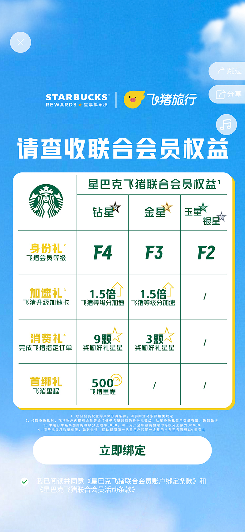 而联合会员计划带来的权益从绑定会员这一步就开始了。如果是星巴克的钻星会员,完成会员绑定就能马上领到 500 的飞猪里程(马上就可以用起来),而在绑定后,星巴克的金星和钻星会员可以以 1.5 倍的飞猪定级里程等级分加速累积,让消费攒里程更加高效。