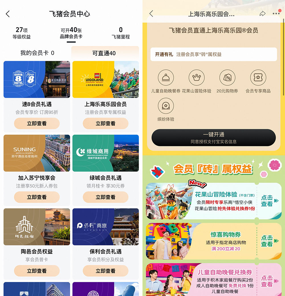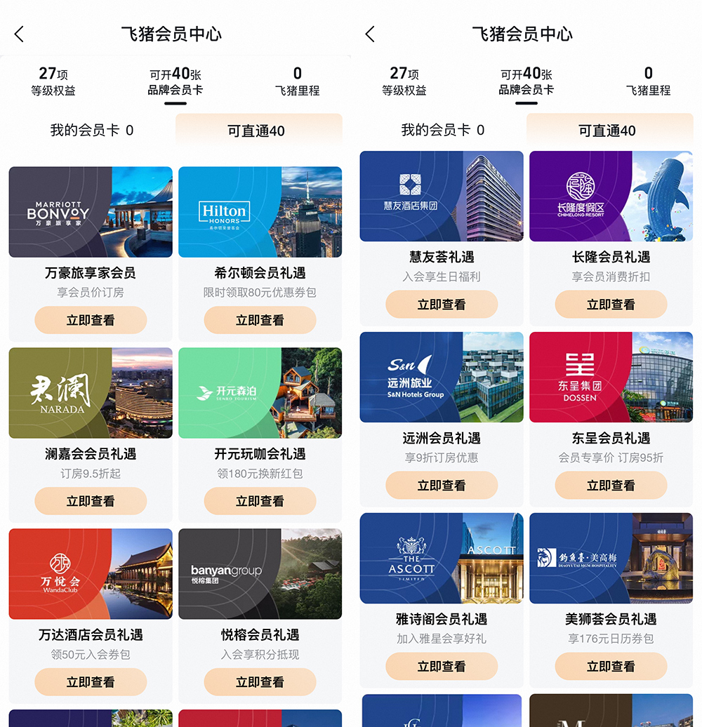 所以,如果说之前和希尔顿集团、东航、亚朵的合作,只是基于特定的酒店和航空公司来为会员带来多一层的福利,现在和飞猪的合作则是一次性解锁了上百种权益,覆盖了涉及各个类别的、全场景出行的体验,这是飞猪的优势,也让这次联合会员计划格外有吸引力。