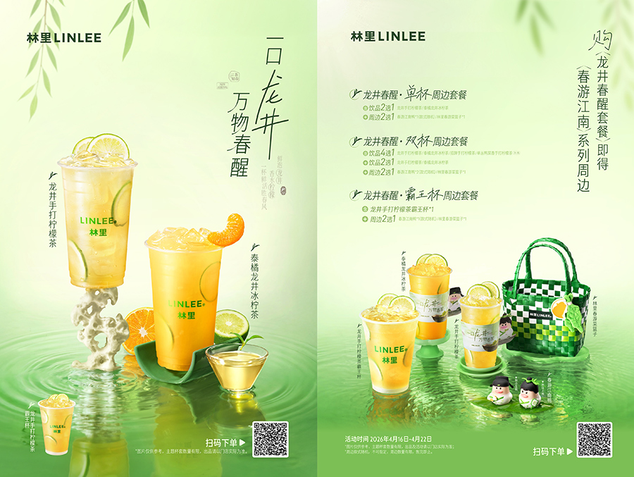 4 月 16 日,LINLEE 林里正式推出全新春季限定茶饮“龙井系列”,系列以“一口龙井,万物春醒”为主题,将中国传统名茶龙井的“鲜灵”和林里标志性香水柠檬的“清香”深度融合带来。