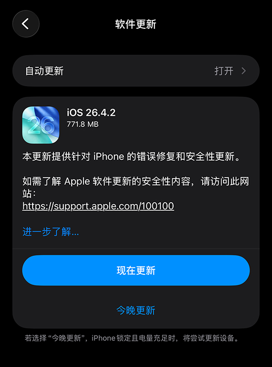 4 月 23 日,苹果推送了 iOS 26.4.2、iPadOS 26.4.2 和 iOS 18.7.8、iPadOS 18.7.8 系统版本更新,这次还是错误修复和安全性更新。