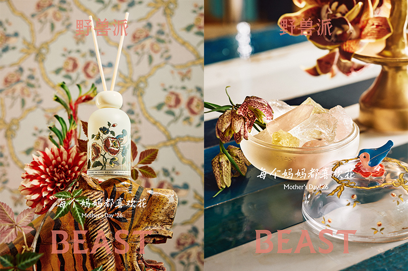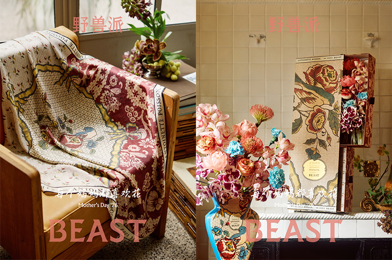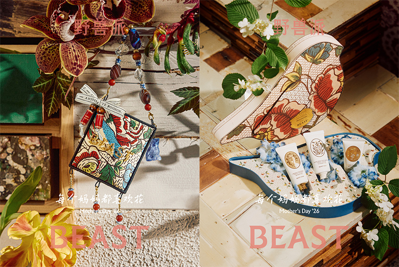 4 月 27 日,野兽派 2026 母亲节“苹果脸玫瑰”系列正式上市。这次系列以“每个妈妈都喜欢花”为主题,以苹果脸玫瑰为灵感,并和巴黎手工多米诺纸工作坊 Antoinette Poisson 合作带来了手工纸艺主题插图,它们以限定印花纹样的方式覆盖到了香薰、蜡烛、丝巾、花礼等多个品类。